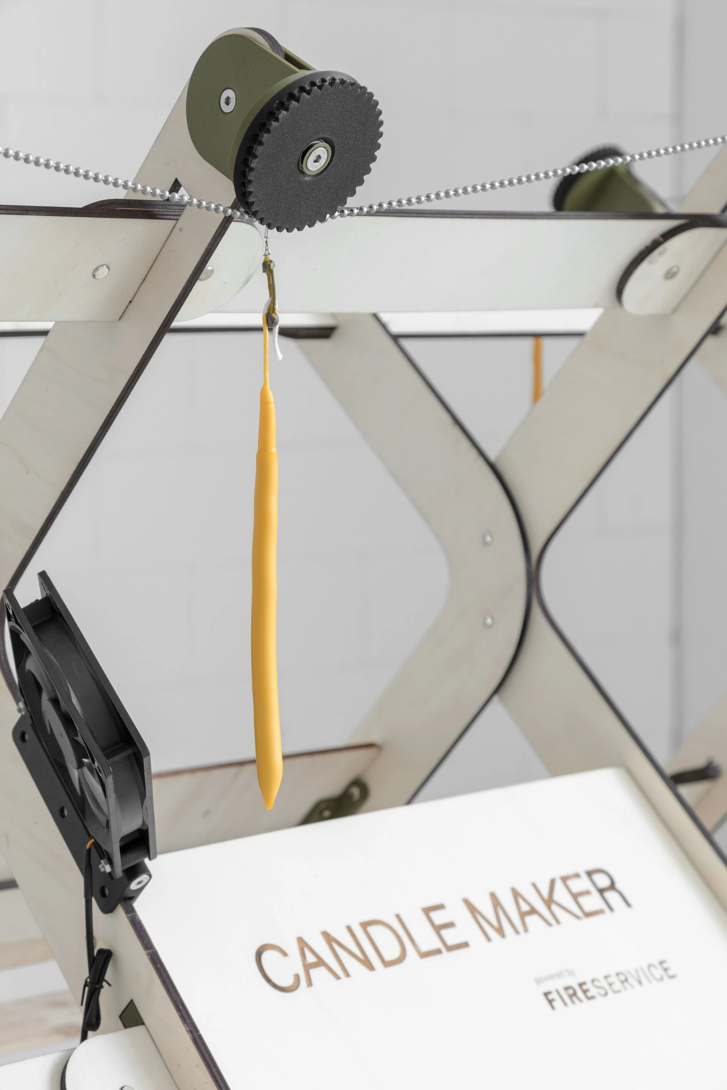 This candle-making machine with which one can produce fragrant bee–wax candles in a very short time. The candle-pulling process is automated. The Candle Maker, built from 3D printed components and laser cut wooden parts, takes over the creative process of shaping and depending on the speed of rotation of the drying machine and the length of the wick, – different shaped candles are produced. While Fireservice is known for doing everything possible to keep fire out, the opening of the new production and storage hall and the presentation of the solid concrete door was taken as an opportunity to produce a first edition of the Candle Maker, making a limited edition of candles as a symbol of controlled and peaceful fire. Visitors to the opening evening were able to look over the shoulder of the designer and his team during production and at the end of the evening, – take a candle home with them. For the future, the designer dreams of further developing the Candle Maker with his team so that it can be made available online as an open source tool and can be assembled and activated by anyone. With the help of a 3D printer and the valuable expertise of studio employee Amedeo Bonini this further development should be made possible.